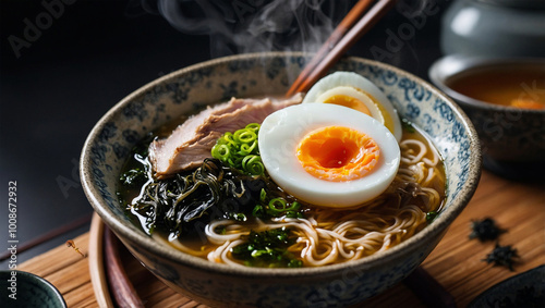 Hot bowl of ramen with sliced pork, seaweed, and a soft-boiled egg, with steam swirling above the broth.