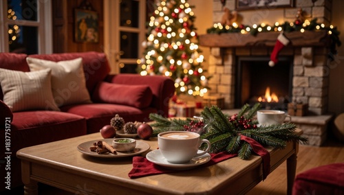 Hot chocolate cup on wooden table with Christmas tree background