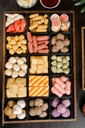 Hot Pot Ingredients Variety Box with Meatballs Sausages Tofu and Vegetables for Asian Cooking