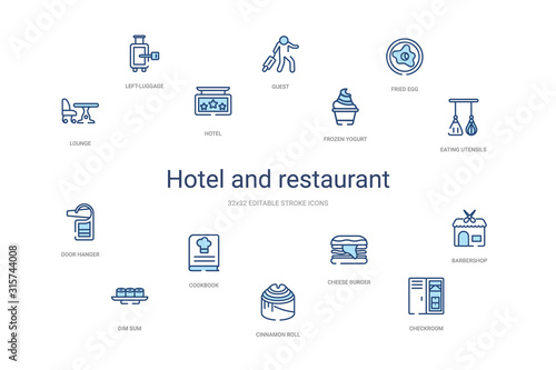 hotel and restaurant concept 14 colorful outline icons. 2 color blue stroke icons
