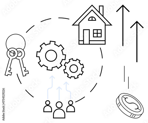 House, keys, arrows, gears, and people icons interconnected by dotted lines. Ideal for real estate, investments, teamwork, property management business growth financial success simple flat