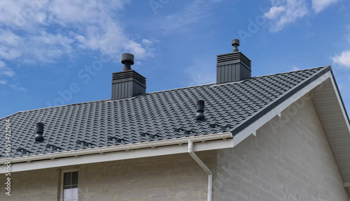 roof, gutter, pipe, ventilated, chimney, white, house, facades, eaves, slope, trench, plastic, grey, building, construction, architecture, exterior, wall, system, drainage, roofing, ventilation, background, sky, drain, home, fascia, ridge, junction, cap, element, roof, pipe, bracket, tile, cover, modern, functional, industrial, rooftop, rain, corner, flow, pipeline, outside