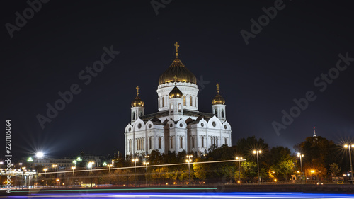 храм Христа спасителя на фоне вечернего города при ночном освещении
