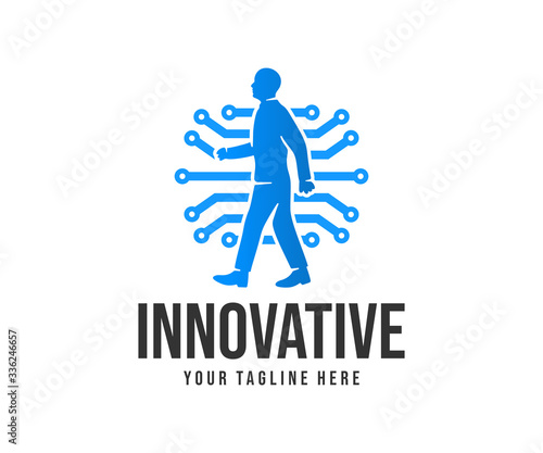 Human is walking in circuits electronics grid, innovative technology, logo design. Artificial intelligence and technology CPU Mind, vector design and illustration