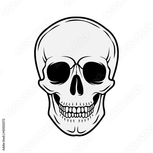 Human skull. Front view. Vector black and white hand drawn illustration isolated on white background