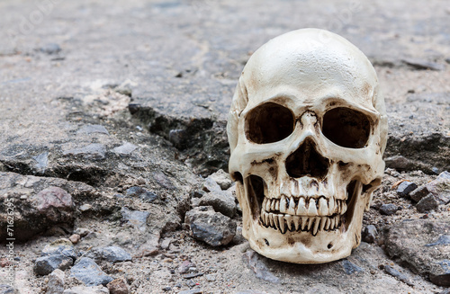 Human skull on crack cement street