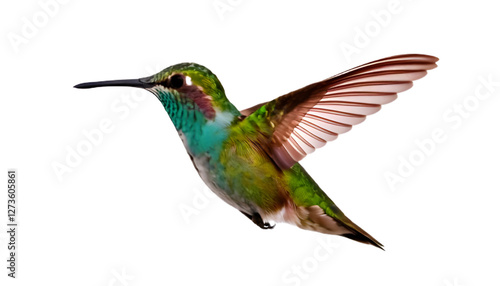 Hummingbird in flight emerald and russet plumage isolated on clear png background