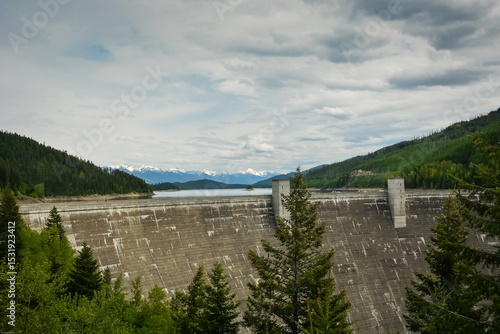 Hungry Horse dam and reservoir in the Flathead valley of northwestern Montana. The dam is one of the highest in the US and the reservoir is 34 miles long with 170 miles of shoreline