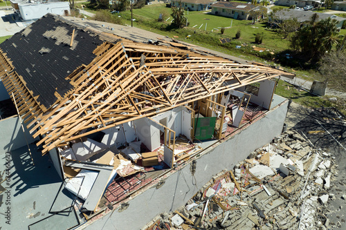 Hurricane Ian destroyed house roof and walls in Florida residential area. Natural disaster and its consequences