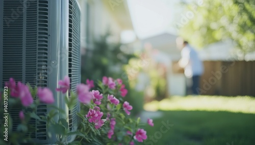 air conditioner, unit, flower, pink, bloom, blossom, plant, garden, backyard, lawn, grass, summer, home, house, residential, cooling, system, technology, equipment, metal, grey, green, leaf, sun, day, light, nature, flora, environment, family, people, blur, background, sharpened, shallow, depth, photo, image, outside, scene