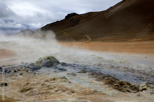Hverir / Iceland - August 30, 2017: Hverir geothermal and sulfur area near Namafjall mountain, Myvatn Lake area, Iceland, Europe