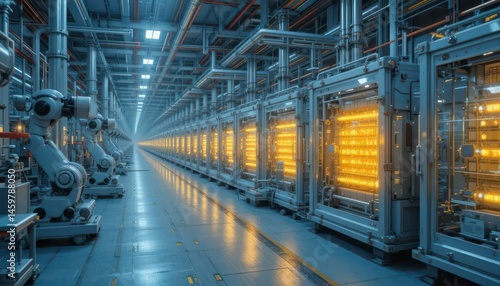 Hydrogen fuel cell factory with robotic assembly lines, Industrial Interior With Machinery and Bright Lights