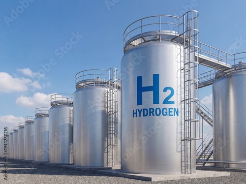 Hydrogen storage tanks with ladders and catwalks under blue sky