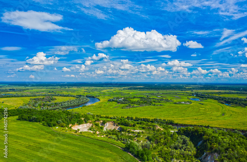Hyperlapse aerial view of a summer landscape and summer cloudy skies. Timelapse of a drone flying above a river with fields around it. Beautifull wide lens shot of summer scenery above a countryside.