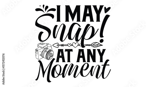 I May Snap! At Any Moment - Photographer T-Shirt Design Featuring Hand Written Calligraphy Phrase. Typography Vector Graphic Design Element Isolated on White Background.