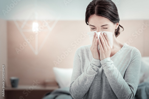 I must to struggle. Ill sad unsatisfied woman spending time in the bright room sneezing and closing her eyes.