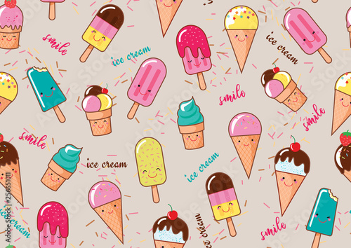 Ice cream seamless pattern on light grey background. Ice cream illustration background pastel colors flat style. Assorted Ice Cream for print card and textile