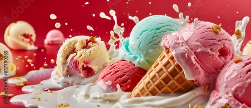 ice cream, ice cream cone, scoop, cone, milk, dessert, sweet, creamy, delicious, refreshing, summer, treat, cold, glacé, colourful, vanilla, strawberry, mint, red, white, green, pink, food photography, closeup, macro, hi-res, food, dairy, snack, confectionery, confection, epicure