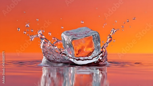 Ice Cube Splashes Into Water Against Vibrant Orange Background Creating Dynamic Ripples
