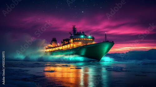 ship, ice, water, ocean, navigation, arctic, colours, night, glow, travel, exploration, adventure, transport, technology, environment, sea, landscape, winter, light, horizon, cloud, atmosphere, vessel, marin, journey, cold, nature, scenery, illumination, movement, glacé, wave, beauty, sky, twilight, expedition, research, solitude, calmness, power, engineering, safety, mission, polar, iceberg, design