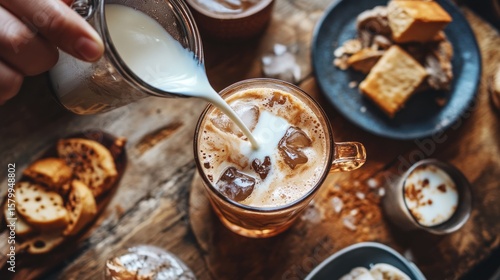iced, hot drink, milk, pouring, drink, breakfast, dessert, brown, wooden, table, glasses, sweet, cold, dairy, texture, food, rustic, top, view, hand, cube, brownie, bakery, crispy, slice, baked, delicious, beverage, creamy, smooth, fresh, ingredient, morning, light, meal, natural, refreshing, deliciously