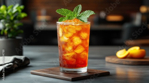Iced tea drink with mint garnish