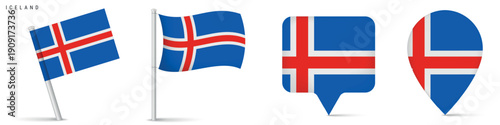 Iceland national flag icon set featuring waving flag and location map pins. Isolated design suitable for travel, geography, navigation and northern Europe concepts.