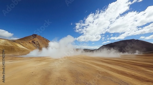 Icelandic Geothermal Landscape: A Breathtaking Panorama of Steam, Mountains, and Volcanic Terrain