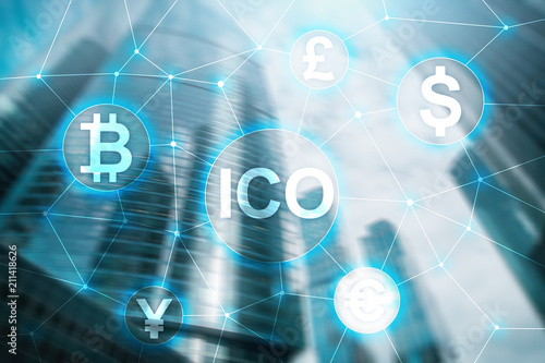 ICO - Initial coin offering, Blockchain and cryptocurrency concept on blurred business building background.