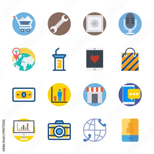 microphone, shopping cart, presentation, photo camera, worldwide, shopping bag, smartphone, profit, shop, statistic, money, wrench, icon, vector, illustration, set, pictogram, symbol, signs, design, art