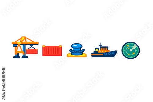 vector, shipping, logistic, crane, container, mooring, boat, navigation, transport, freight, cargo, dock, harbor, industry, delivery, supply, chain, equipment, ocean, waterway, movement, sailing, loading, unloading, marking, tool, route, port, maritime, scanning, technology, operation, import, export, vessel, good, commerce, icon, act, element