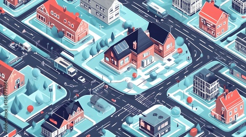 Icy Isometric Cityscape with Snowy Roads and Colorful Buildings