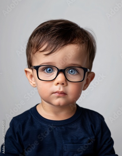 ID Photo for Passport : European baby boy with straight short black hair and blue eyes, with glasses and wearing a navy t-shirt