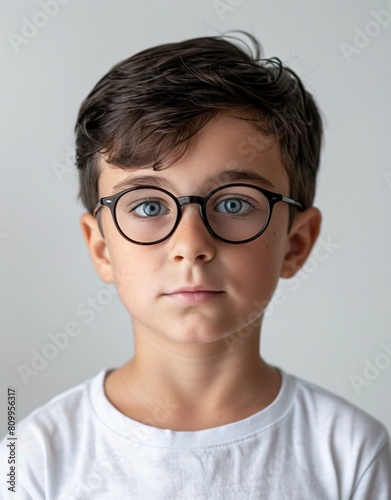 ID Photo for Passport : European child boy with straight short black hair and blue eyes, with glasses and wearing a white t-shirt