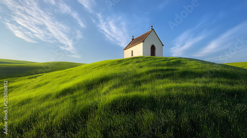 Idyllic chapel in Tuscany with green grass and blue sky
