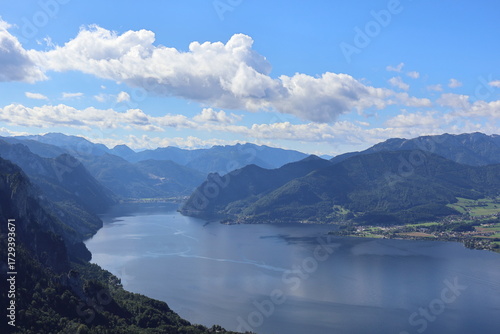 Idyllic panorama of mointain Lake Traunsee in Gmunden Austria