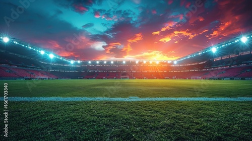 Illuminated arena with green field and colorful sky above