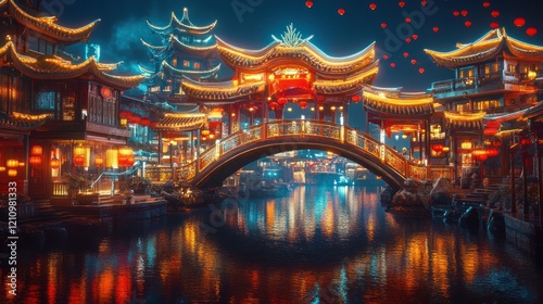 night, bridge, city, architecture, asian, chinese, lantern, light, water, building, red, gold, colours, festival, celebration, culture, travel, tour tourism, scenic, beautiful, vibrant, colourful, traditional, ancient, historic, exotic, mysterious, romantic, magic, fantasy, dark, sky, town, street, river, canal, house, lamp, holiday, glow, illuminated, scene, view, image, design, art, illustration