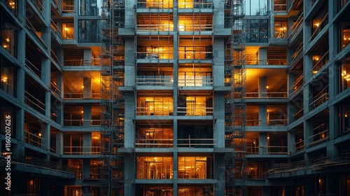 building, construction, concrete, architecture, modern, city, skyscraper, urban, night, dusk, structure, framework, design, development, apartment, industrial, progress, growth, illuminated, light, window, steel, metal, scaffolding, city landscape, infrastructure, engineering, property, housing, residential, commercial, project, evening, dark, exterior
