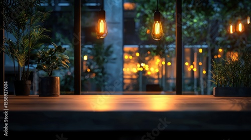 light, evening, ambience, decor, interior, warm, glasses, window, plant, nature, bokeh, background, urban, modern, design, elegant, wooden, surface, table, glowing, lamp, fixture, bulb, illumination, style, soft, sharpened, detail, closeup, dark, shadow, pot, vibrant, aesthetic, calm, peaceful, cosy, natural, inviting, minimalist, space, empty, perspective, depth, layer