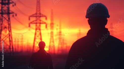 power, grid, maintenance, industrial, silhouette, crew, tower, glowing, sky, scale, panorama, high, voltage, electricity, energy, technology, infrastructure, electrical, utility, service, working, height, night, dusk, engineering, line, industry, construction, copy, space