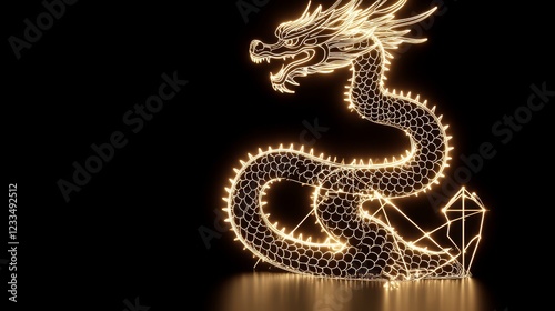 dragon, auspicious, render, background, illuminated, symbolic, mythical, fantasy, intricate, ornate, prosperity, gold, power, strength, mystical, light, artwork, shine, majestic, glowing, energy, three-dimensional, detailed, digital, fortune, wealth, gem, elegance, spiritual, bright, dark, grace, representation, luck, art, crystal, mysterious, beauty, gem, wireframe, tradition, model, creature, sculpture, culture, abstract, line