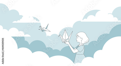 Illustration depicting a girl releasing a paper crane into a cloud-filled sky conveying peace hope and tranquility