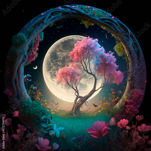 Illustration fantasy fairy tale tree landscape with moon in the evening AI generated content