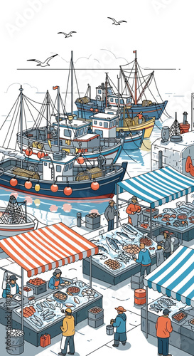 harbor, boat, market, stall, people, illustration, drawing, water, sea, city landscape, sky, bird, fish, food, seller, commerce, awning, blue, orange, white, grey, mast, fishing, net, activity, tied-up, urban, scene, daytime, artwork, graphic, detailed, crowd, selling, buying, trade, maritime, dock, port, waterfront, transportation