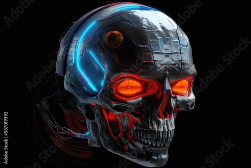 Illustration of a human skull in a futuristic metal helmet with bright red messages on the glass and an orange, blue, and scratched finish. floating in space is a dead guy. game prize, rank advancemen