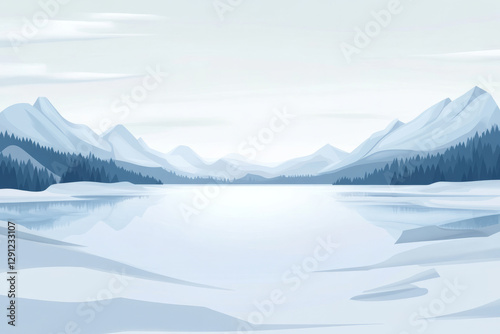 Illustration of a large, frozen lake surrounded by snow covered mountains. The sky above is pale and clear, with soft clouds drifting by, and the whole scene feels calm and peaceful, evoking a sense