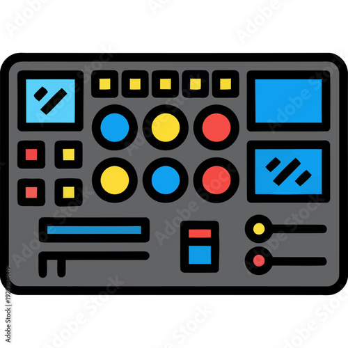 Illustration of control panel with buttons and sliders in various colors and shapes