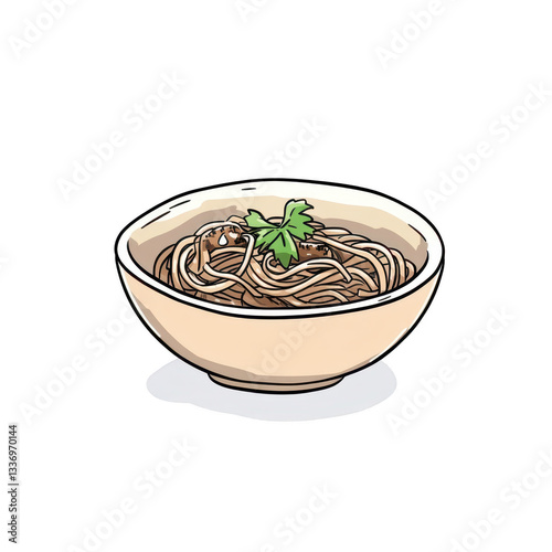 Illustration of Cooked Noodles in a Bowl with Fresh Green Herb