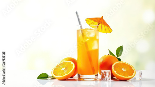 illustration of cool drink in glass with straw, umbrella, and ice cubes, surrounded by oranges, athmosphere summer time